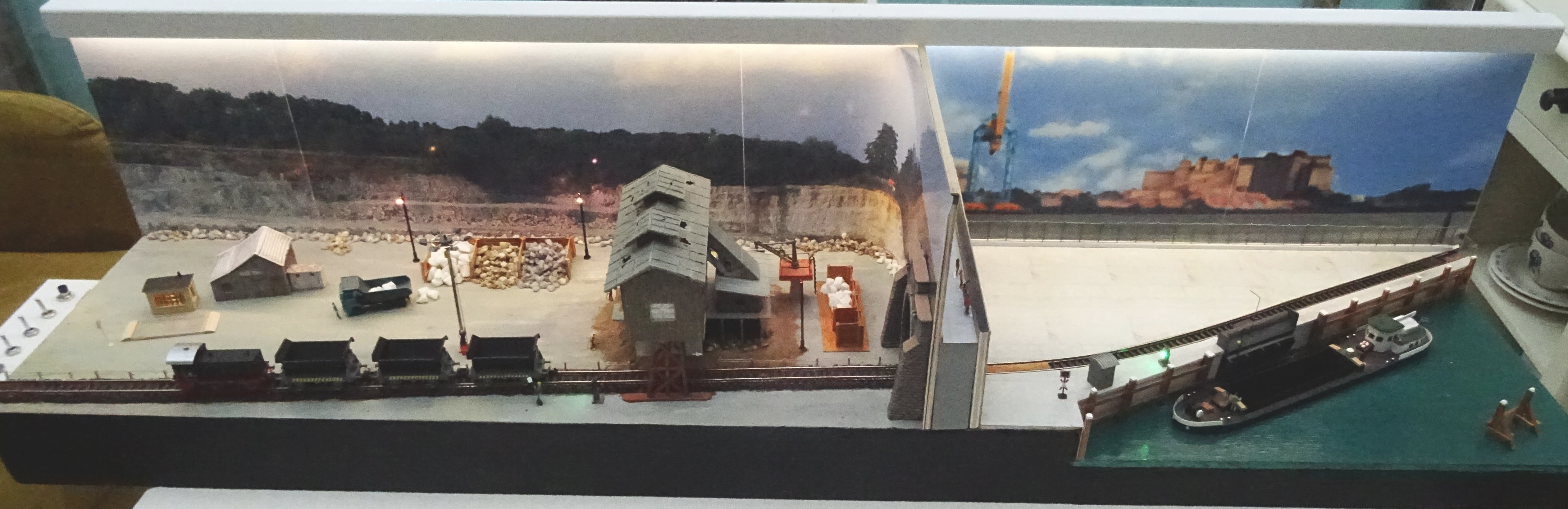 De dioramabaan Steenstort worden stenen gestort in wagons die vervolgens automatisch doorrijden naar de haven alwaar de stenen uit de wagons worden gelost in een binnenvaartschip.