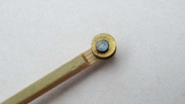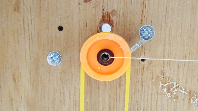Onder de baan zit aan het messing pijpje met daarop een snaarwiel.