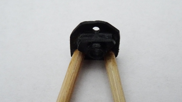 De twee staanders van de hijskraan worden in twee geboorde gaatjes gelijmd. Het draaiende gedeelte valt in het andere gat.