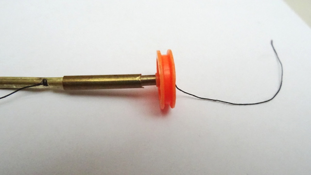 Hier is goed te zien dat de hijsdraad door een klein gaatje in het midden van de draaias naar beneden gaat.