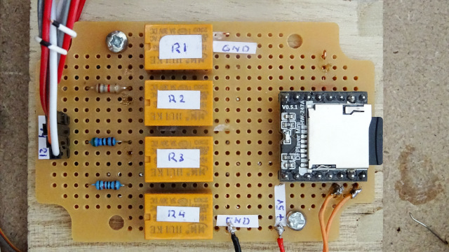 Om 4 geluidsignalen hoorbaar te maken over slechts één luidpreker wordt gebruik gemaakt van 3 weerstanden en 3 relais aangesloten op de DFPlyer