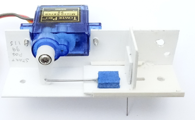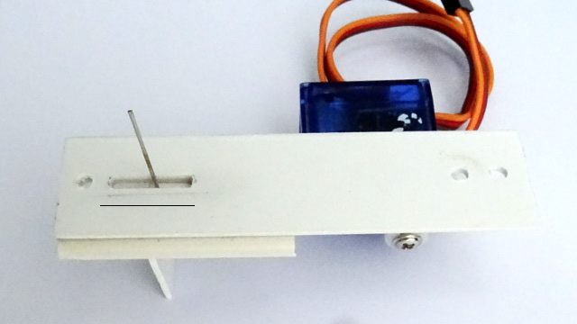 De servo zit ingeklemd in een L-profiel van L=5cm en beweegt een arm horizontaal.